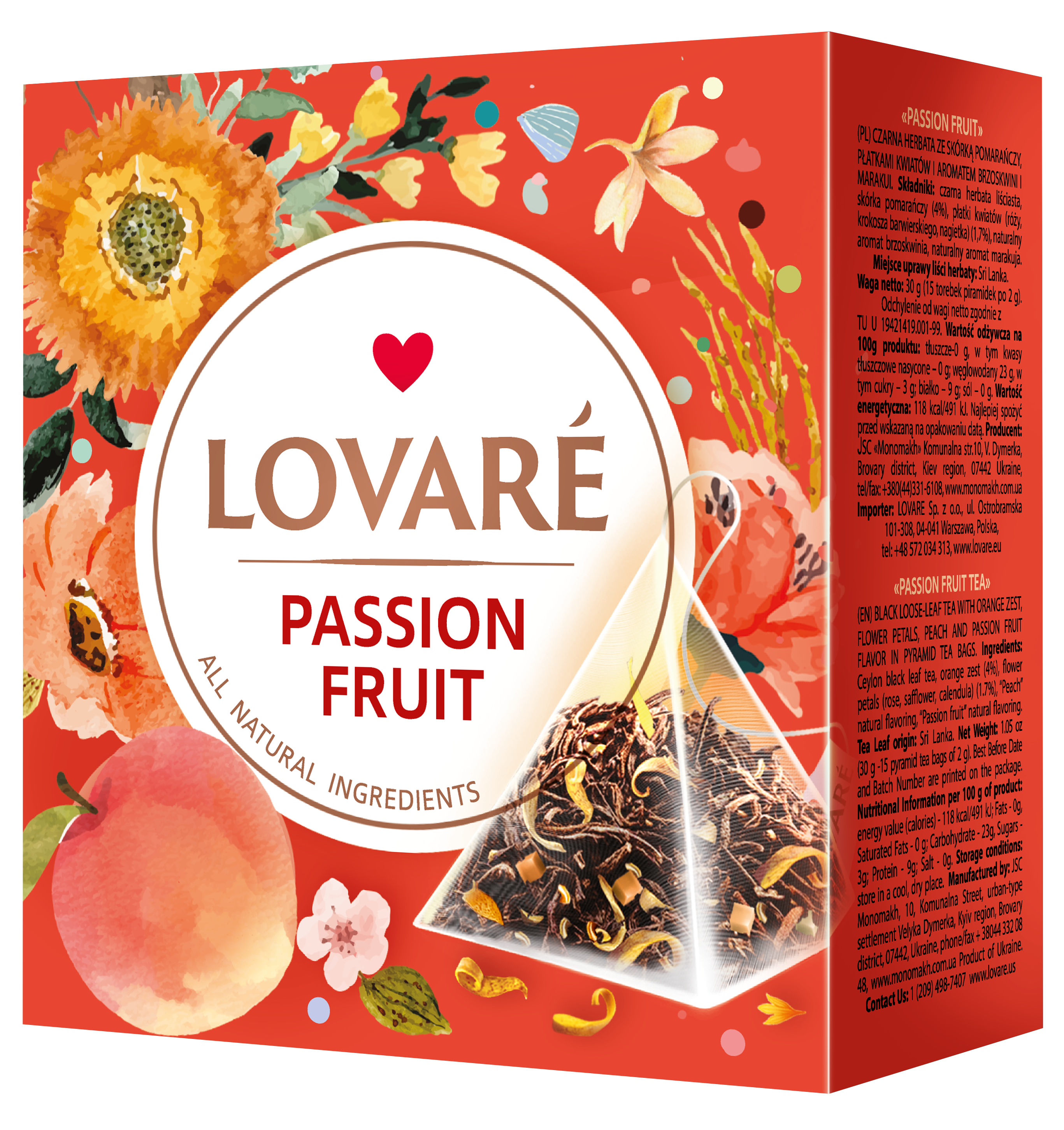Amestec de ceai negru, coajă de portocale și petale de flori, cu aromă de piersici și maracuia.